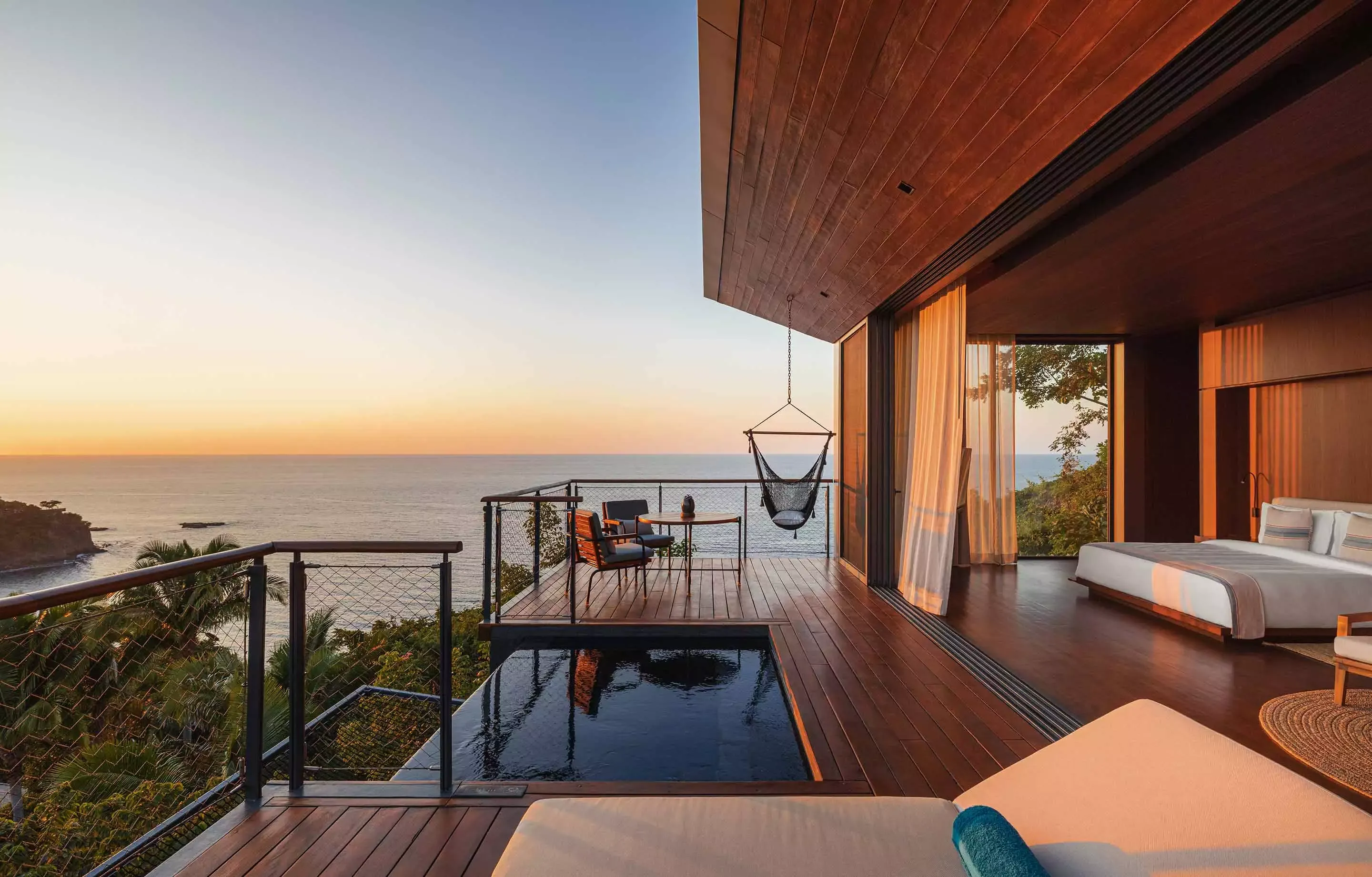 Stay in private cliffside villas that offer stunning views of the Pacific Ocean and the surrounding rainforest. Each villa is designed with elegant, modern decor, featuring private plunge pools and expansive terraces for a truly luxurious experience.